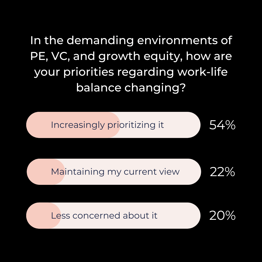 As the professional landscape evolves, so do our priorities. A recent poll we conducted reveals a significant trend among professionals in PE, VC, and growth equity: 54% are increasingly prioritizing work-life balance. See the full poll results below and reflect on how the industry’s pace impacts personal and professional lives.